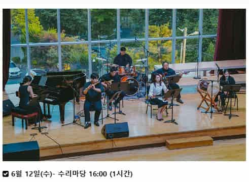 6월 12일 일정 중 수리마당의 피아노 연주 공연은 '강릉학산오독떼기'를 피아노, 기타, 베이스, 드럼, 해금, 대금, 가야금의 조화로 잘 표현한 공연입니다.