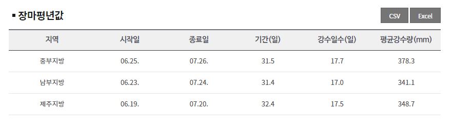지역별로는 남부 지방이 6월 25일, 중부 지방이 6월 28일, 북부 지방이 7월 2일경 장마가 시작되어 약 4주 정도 지속될 것으로 전망하고 있습니다.