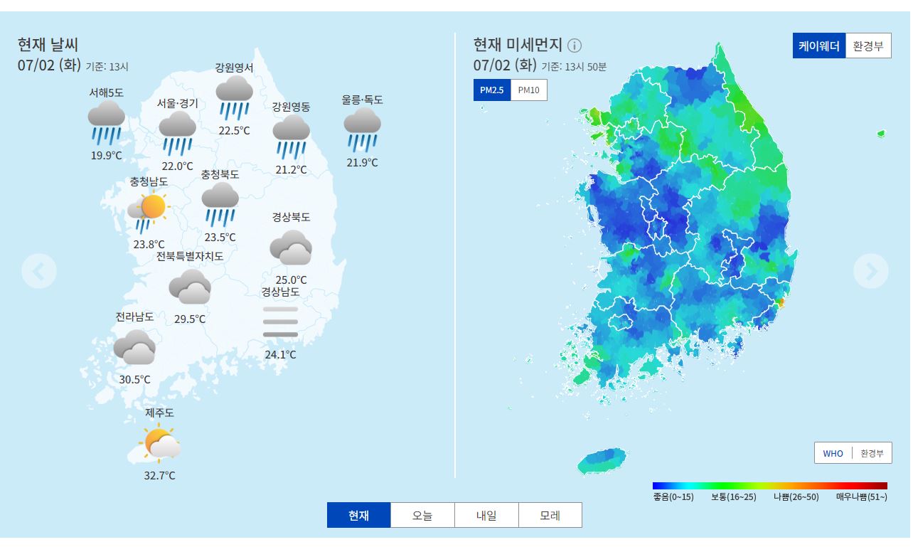 아래 실시간 날씨 정보를 통해 각 지역의 날씨와 동별 날씨 그리고 미세먼지 예보까지 확인하시고 외출 시 미리 대비하시기 바랍니다.