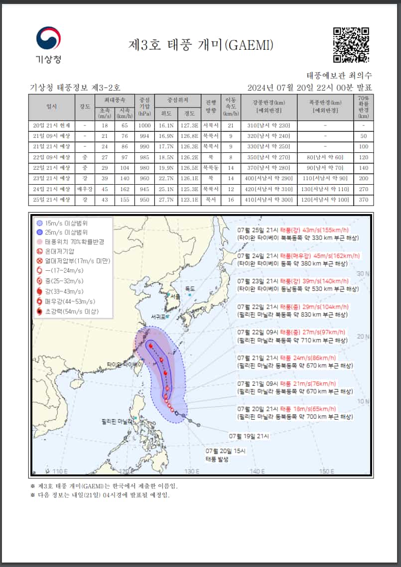 2024년 7월 20일 오후 3시 필리핀 동쪽 해상에서 3호 태풍 '개미'(GAEMI)가 발생했습니다.