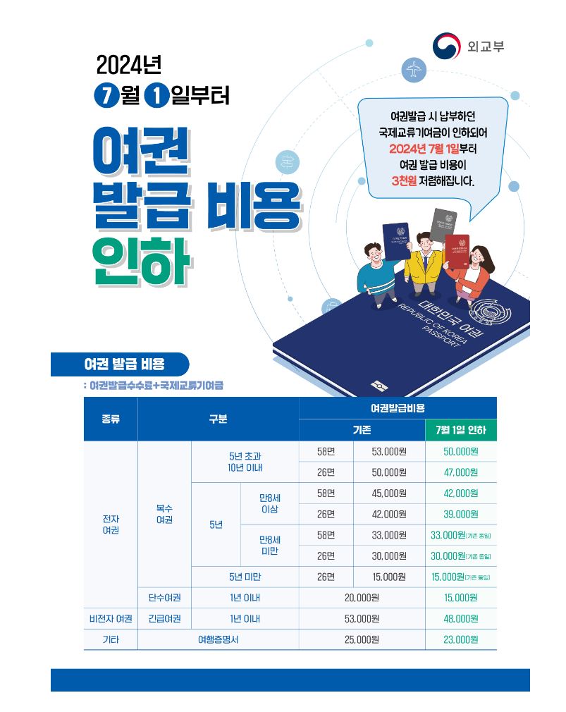 2024년 7월 1일 기준으로 여권 발급 수수료가 일부 인하되었습니다.