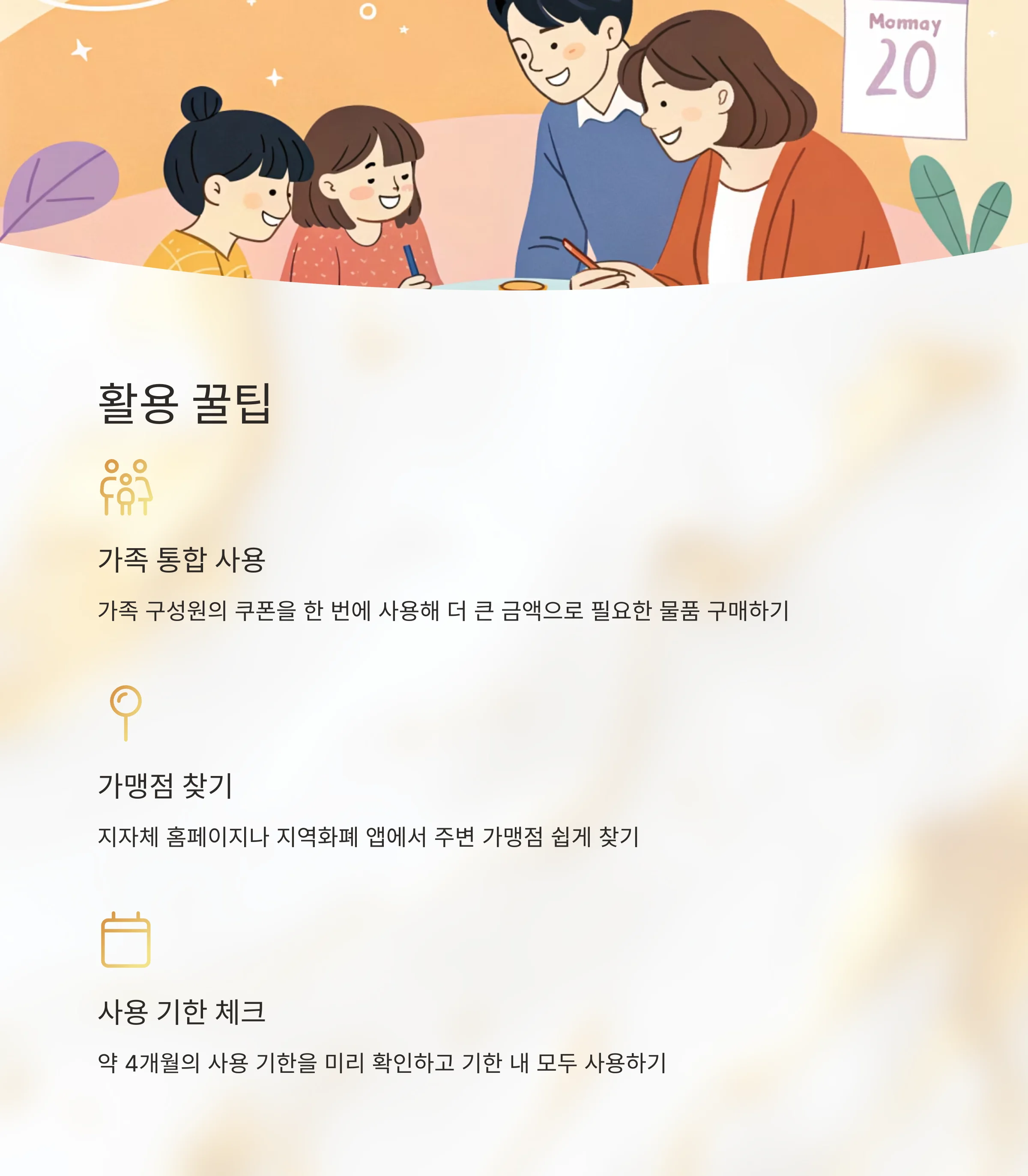 - 5. 사용처 확인 및 사용: 쿠폰은 지역 내 소상공인 가맹점에서만 사용할 수 있으며, 사용 기한(약 4개월) 내에 모두 사용하세요.