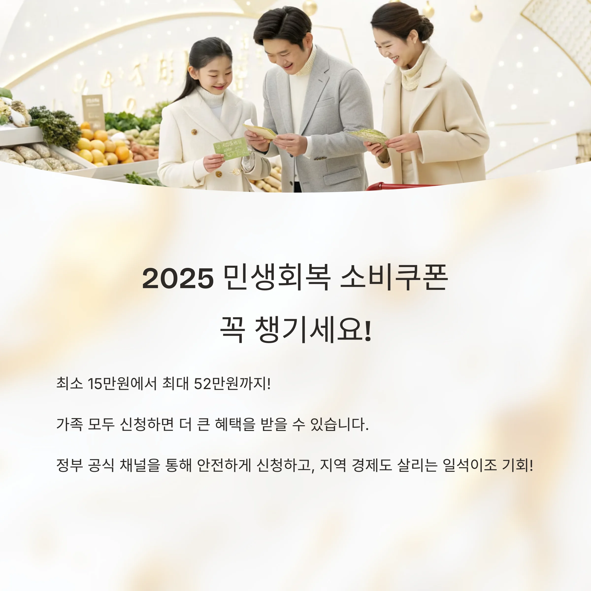 민생회복 소비쿠폰은 내수 활성화와 지역 경제 활성화, 그리고 국민 생활 안정을 동시에 추구하는 정책으로, 전 국민이 혜택을 누릴 수 있도록 설계되어 있습니다.