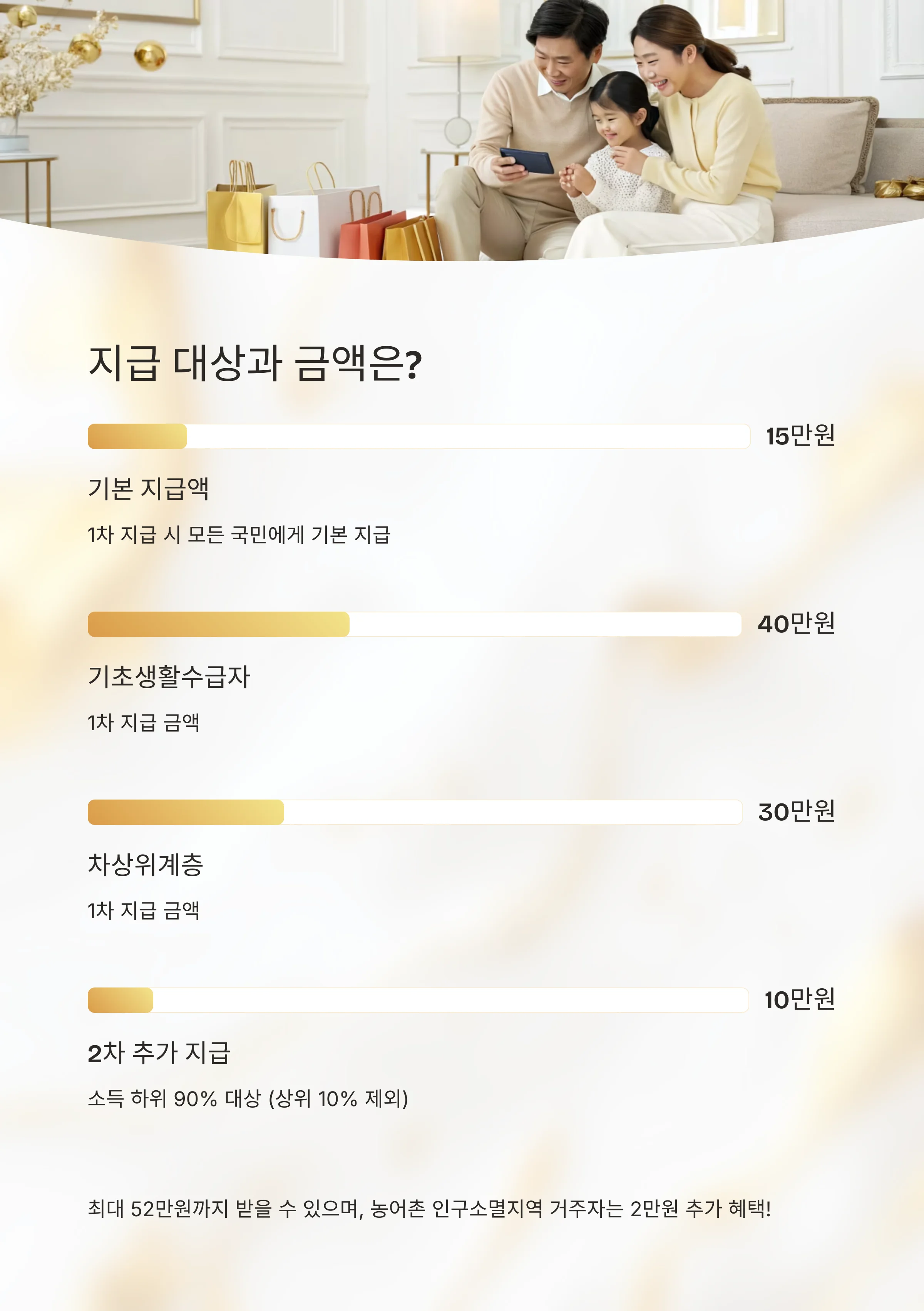 | 지급 금액 | 최소 15만 원 ~ 최대 52만 원(소득·계층별 차등) |