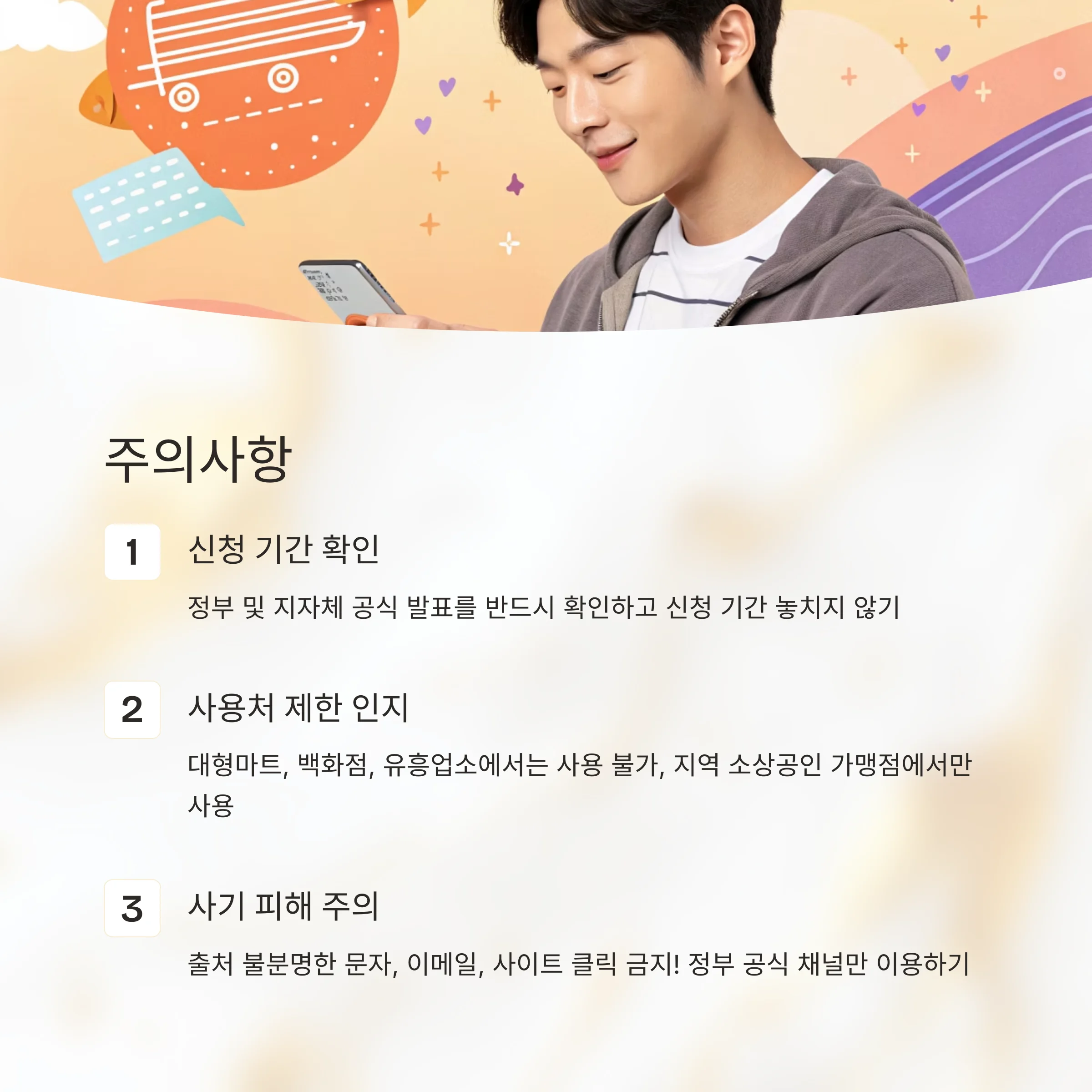 출처 불분명한 문자, 이메일, 사이트는 절대 클릭하지 마세요. 정부 및 지자체 공식 채널을 통해서만 신청하세요. 사용 기한 내에 쿠폰을 모두 사용하는 것도 중요합니다.