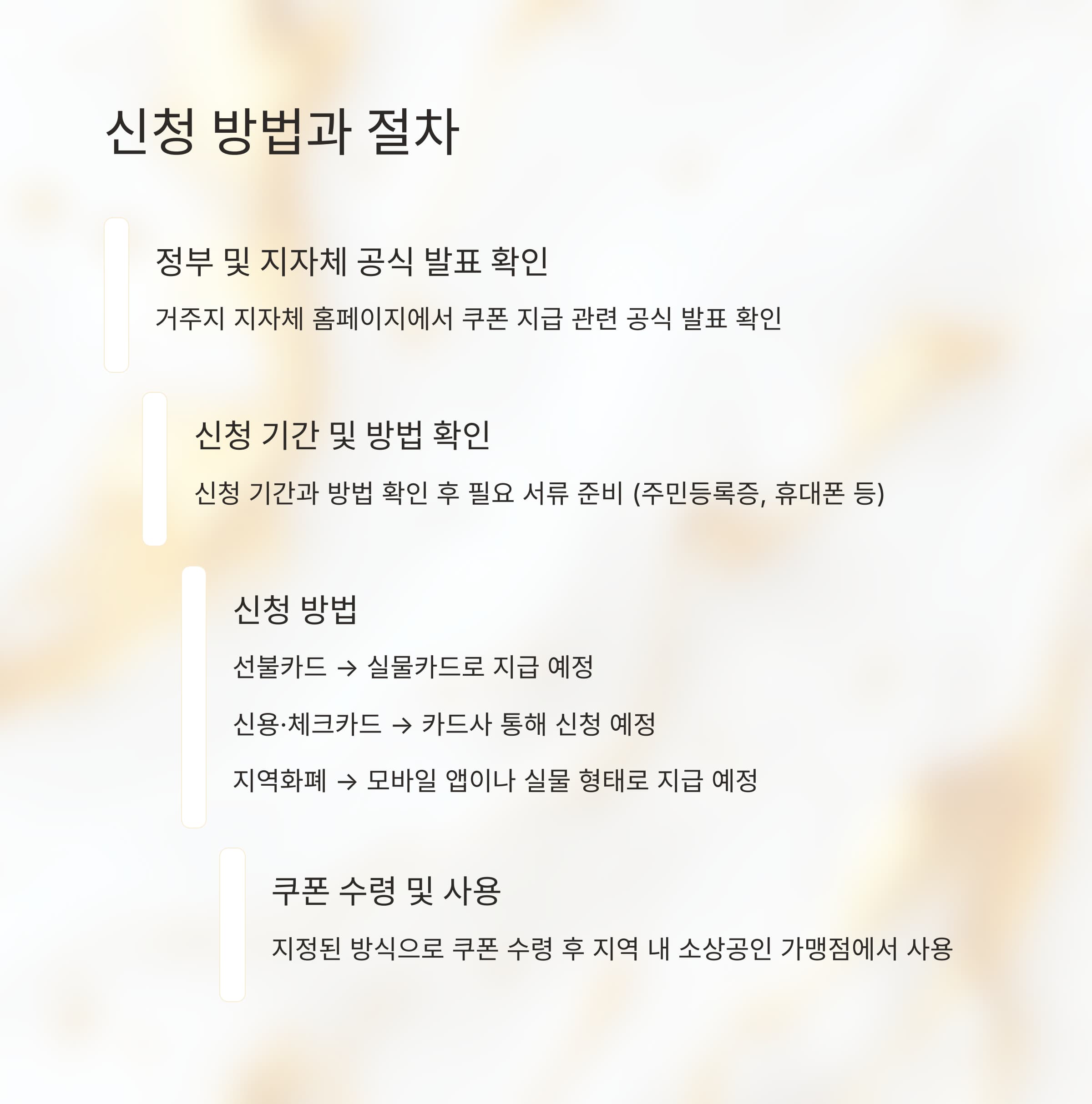 - 4. 쿠폰 수령: 신청이 완료되면, 지정된 방식(지역화폐, 선불카드, 신용·체크카드 등)으로 쿠폰을 받을 수 있습니다.